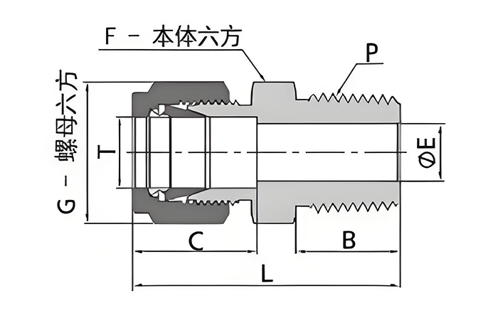 PTFE接头包括:螺纹部、腰部、卡套、螺⺟,接头具有连接牢靠、耐⽼化、耐⾼温性,耐腐蚀性、密封性和反复性好、安装检修⽅便、⼯作安全可靠等特点。