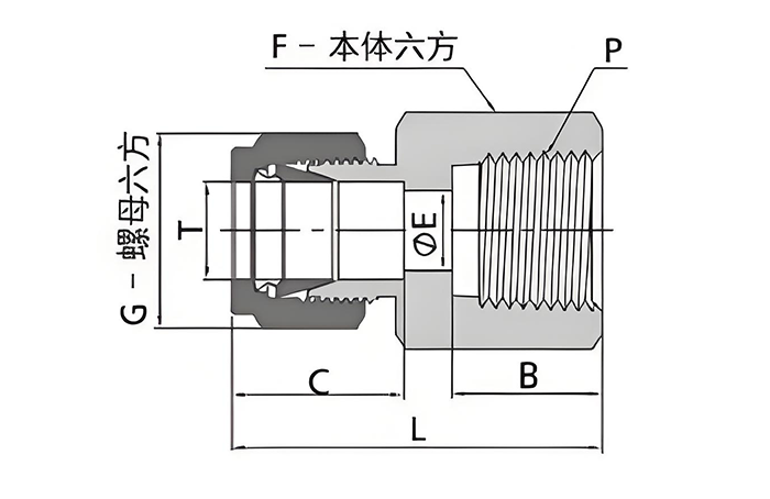 PTFE接头包括:螺纹部、腰部、卡套、螺⺟,接头具有连接牢靠、耐⽼化、耐⾼温性,耐腐蚀性、密封性和反复性好、安装检修⽅便、⼯作安全可靠等特点。